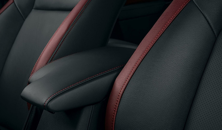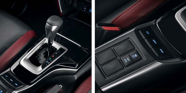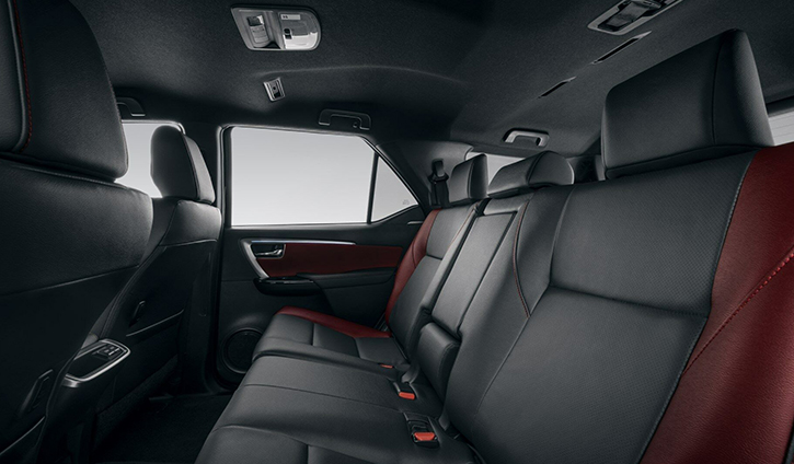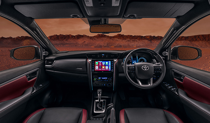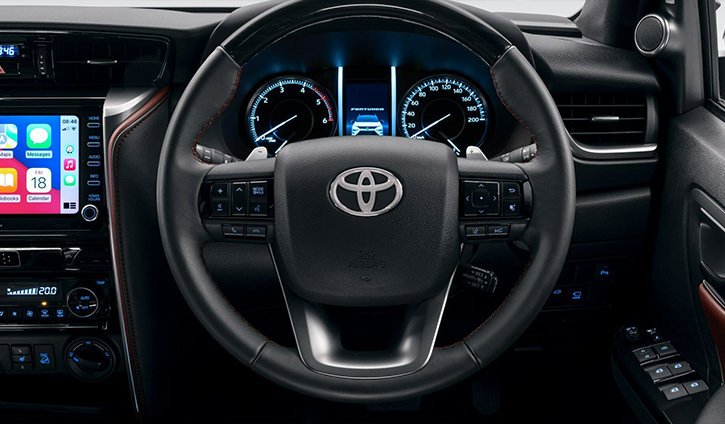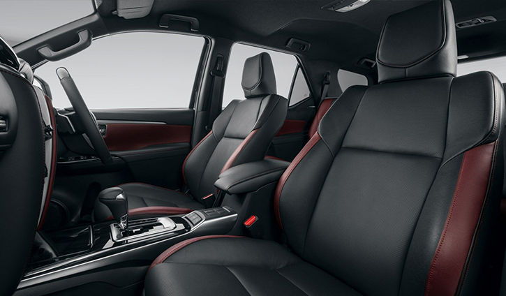 The Toyota Fortuner V-Active’s interior is designed for comfort and luxury, featuring leatherette seats with perforation and contrast maroon stitching. It offers ventilated front seats and an 8-way power-adjustable driver’s seat for personalized comfort. The cabin is wrapped in soft upholstery with metallic accents and woodgrain-patterned ornamentation, complemented by a new Optitron cool-blue combimeter with chrome accents. Advanced features include a digital cluster, wireless charger, and an 11-speaker JBL sound system, enhancing convenience and entertainment for all passengers.