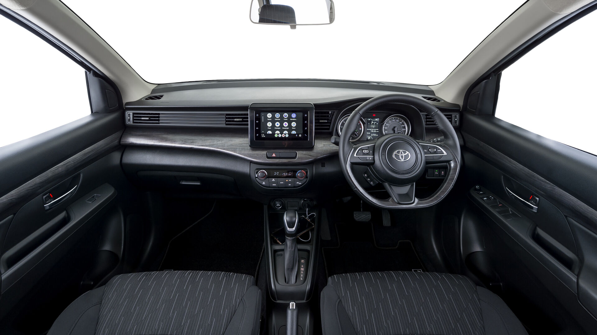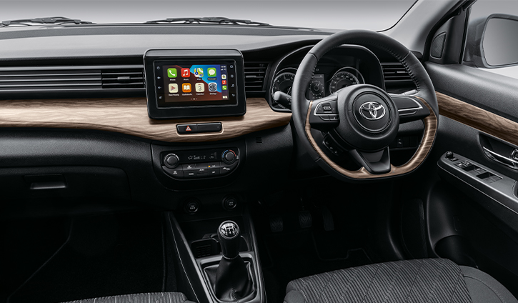 The Toyota Rumion’s interior is designed for comfort, versatility, and modern connectivity, making it an ideal family MPV. It features a spacious seven-seat layout with ample head and legroom in all rows, complemented by plush dual-tone fabric upholstery and elegant metallic teak wood accents on the dashboard and door trims. The flexible 60:40 split-folding second row and reclining third row allow for customizable cargo space, while separate rear air conditioning vents ensure all passengers stay comfortable. Convenience is enhanced with a multifunction steering wheel, Bluetooth and USB connectivity, a touchscreen infotainment system with Apple CarPlay and Android Auto, and multiple power outlets for device charging.