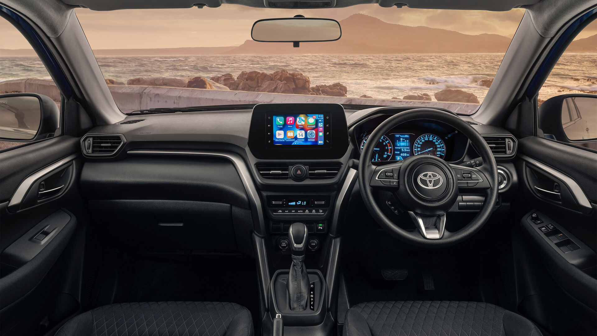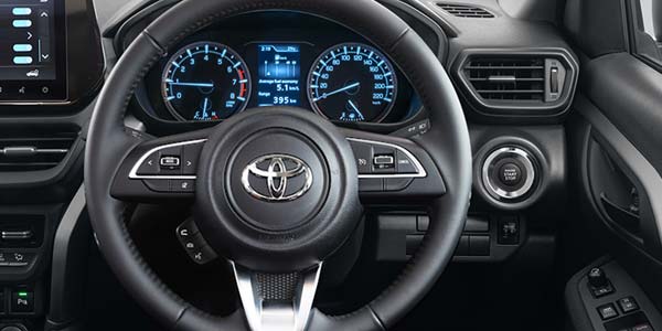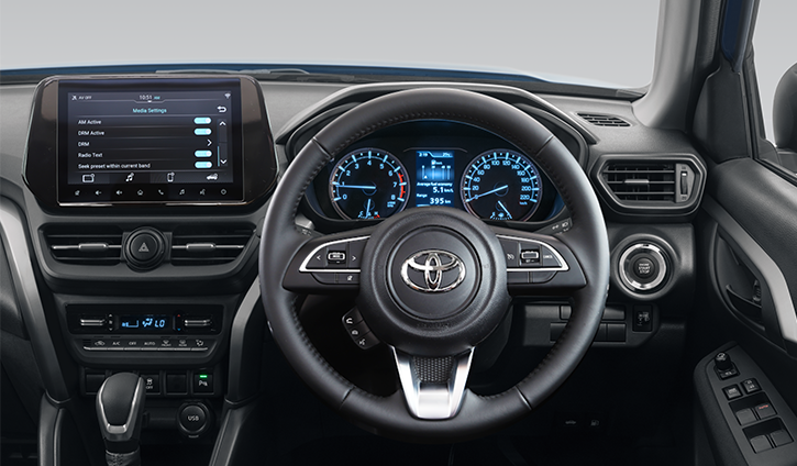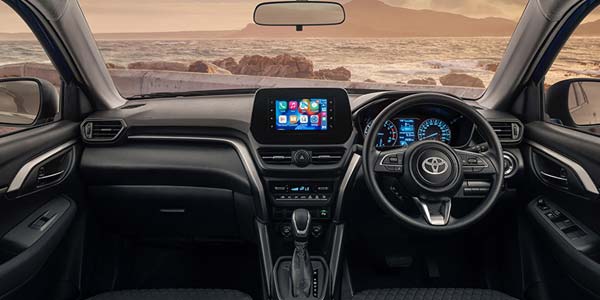 The Toyota Urban Cruiser combines practicality and comfort with a well-appointed cabin featuring fabric-trimmed seats, a leather-wrapped steering wheel, and a 60:40 split-folding rear seat for flexible cargo configurations. The 7-inch touchscreen infotainment system with Apple CarPlay and Android Auto ensures seamless connectivity, while digital automatic air conditioning and front/rear power windows enhance passenger comfort. Thoughtful touches include chromatic accents on door handles, TFT multi-information display, and standard cruise control, all complemented by LED-lit footwells for added ambiance. With dual front, side, and curtain airbags, ISOFIX anchors, and a reverse camera, safety remains a priority in this versatile urban SUV.